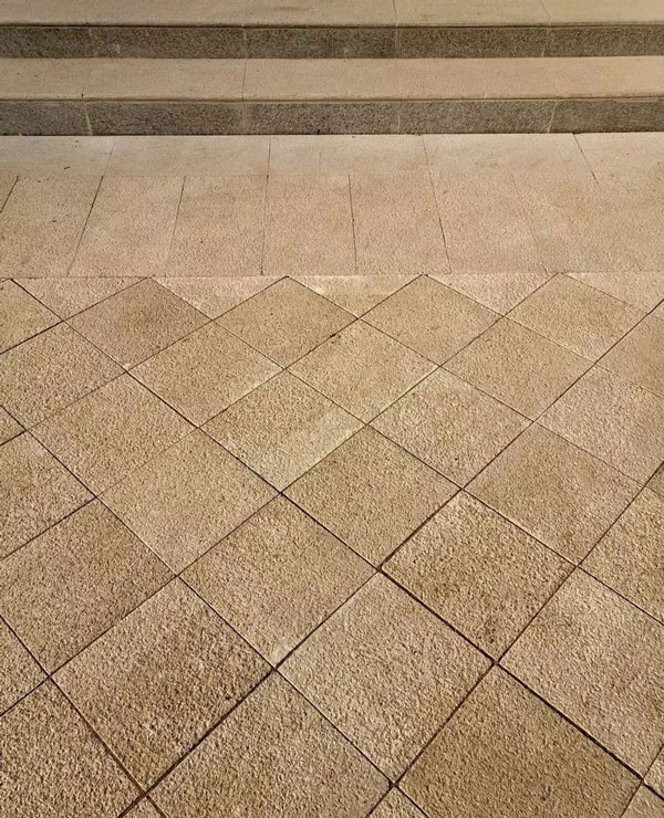 楼栋单元入户平台石材铺装,采用荔枝面芝麻灰、荔枝面芝麻白和荔枝面黄金麻相结合,区域四周以对缝铺贴更显规整,贯通连续、笔直到底,中间区域采用斜铺法,突出空间的灵动性、立体性。两种铺贴方式,如此一来,就能保证整个空间更加清爽整齐,优雅大气。